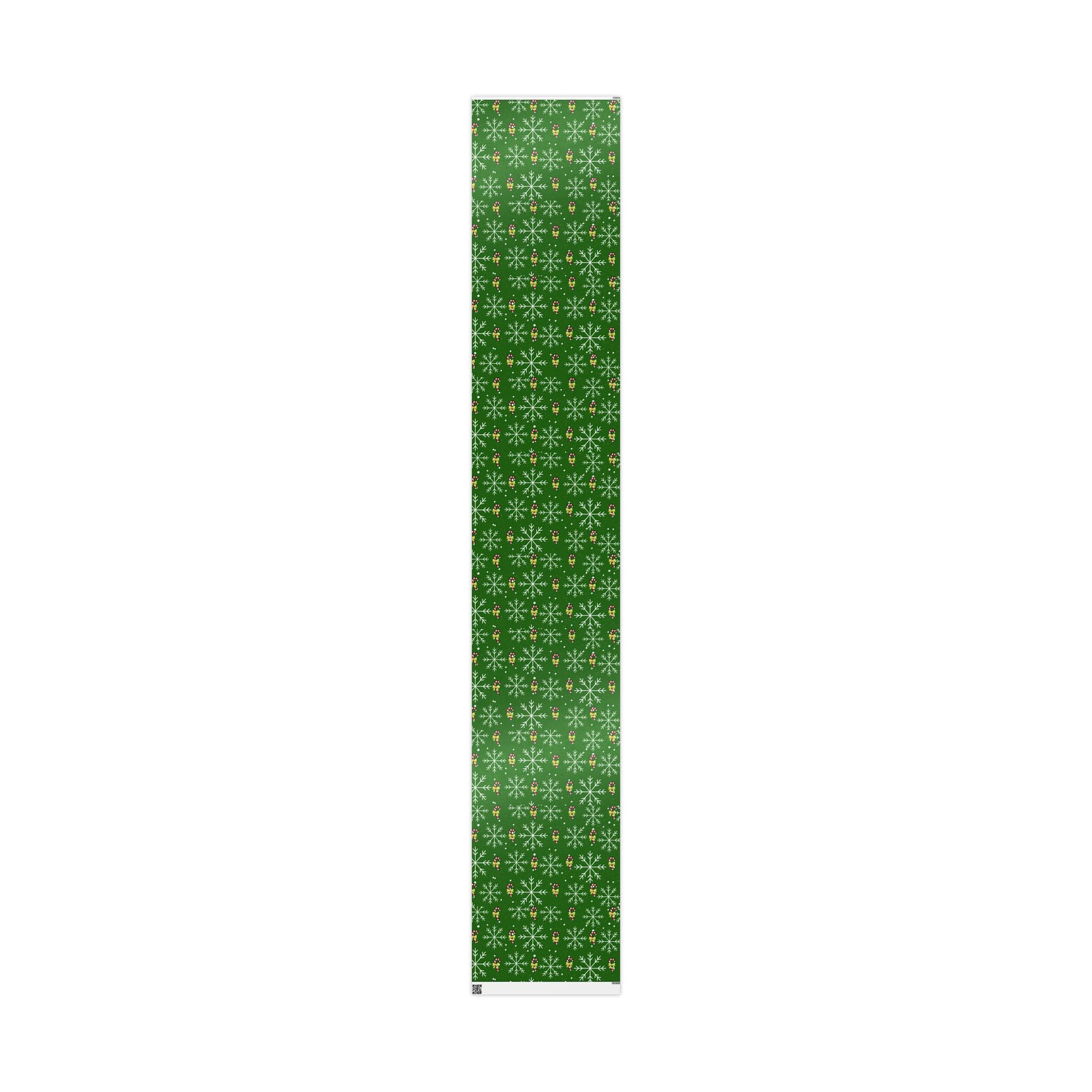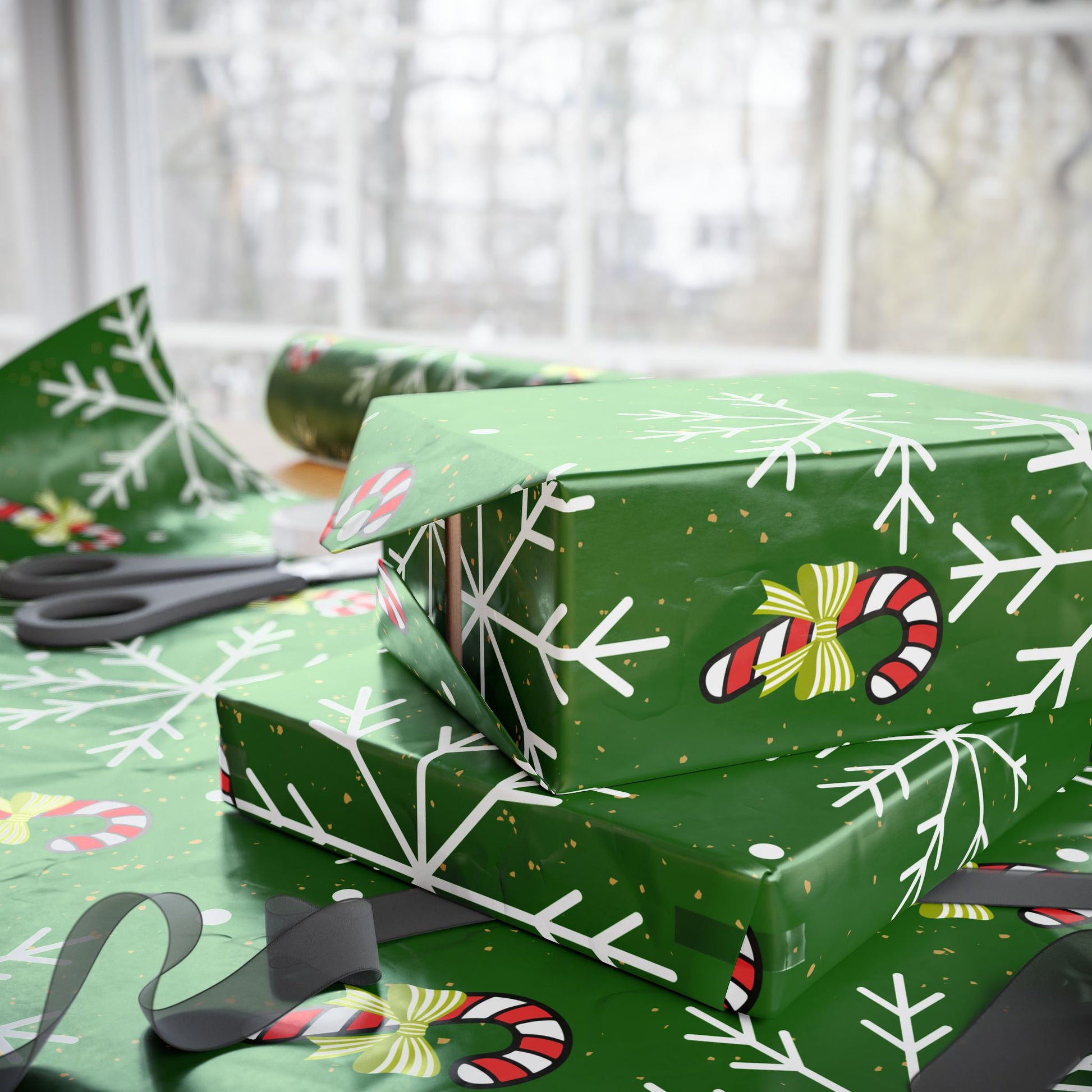 Bring old-fashioned holiday cheer to every carefully wrapped present. This glossy or matte wrapping paper features a deep evergreen background scattered with crisp white snowflake motifs and playful candy-cane characters wearing cozy scarves. The thick 90 gsm fine art stock holds folds and tape cleanly, so ribbons sit neat and edges stay sharp. Available in three generous lengths, the roll works for small boxes, oversized baskets, or long bundles—each sheet prints on one side and leaves a narrow white border with a small product bar and QR code along the top and bottom. Use it to set a warm, handcrafted tone under the tree or to make stockings feel extra thoughtful at winter gatherings.