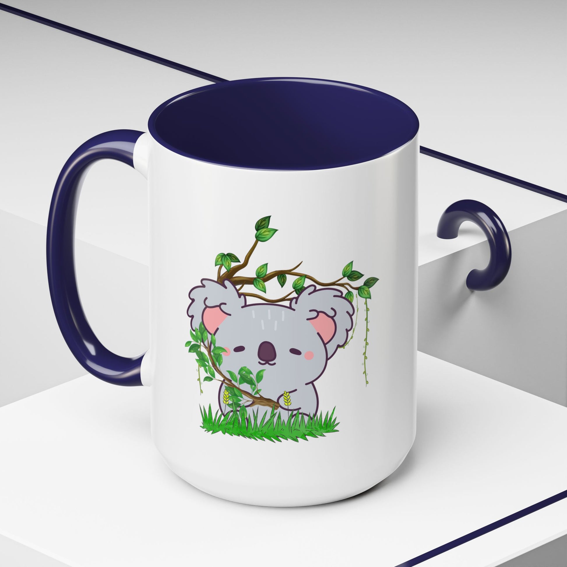 This ceramic accent mug brings a gentle, playful moment to everyday coffee, tea, or cocoa rituals. Soft, pastel artwork of a sleepy koala tucked into leafy branches wraps the white surface, while the colored interior and handle add a surprising pop that complements the illustration. It feels like a quiet pause: warm hands, a sweet smile, and a little reminder to breathe between tasks. Durable and bright, it sits at your desk or kitchen table and makes ordinary mornings feel kinder and more personal.
