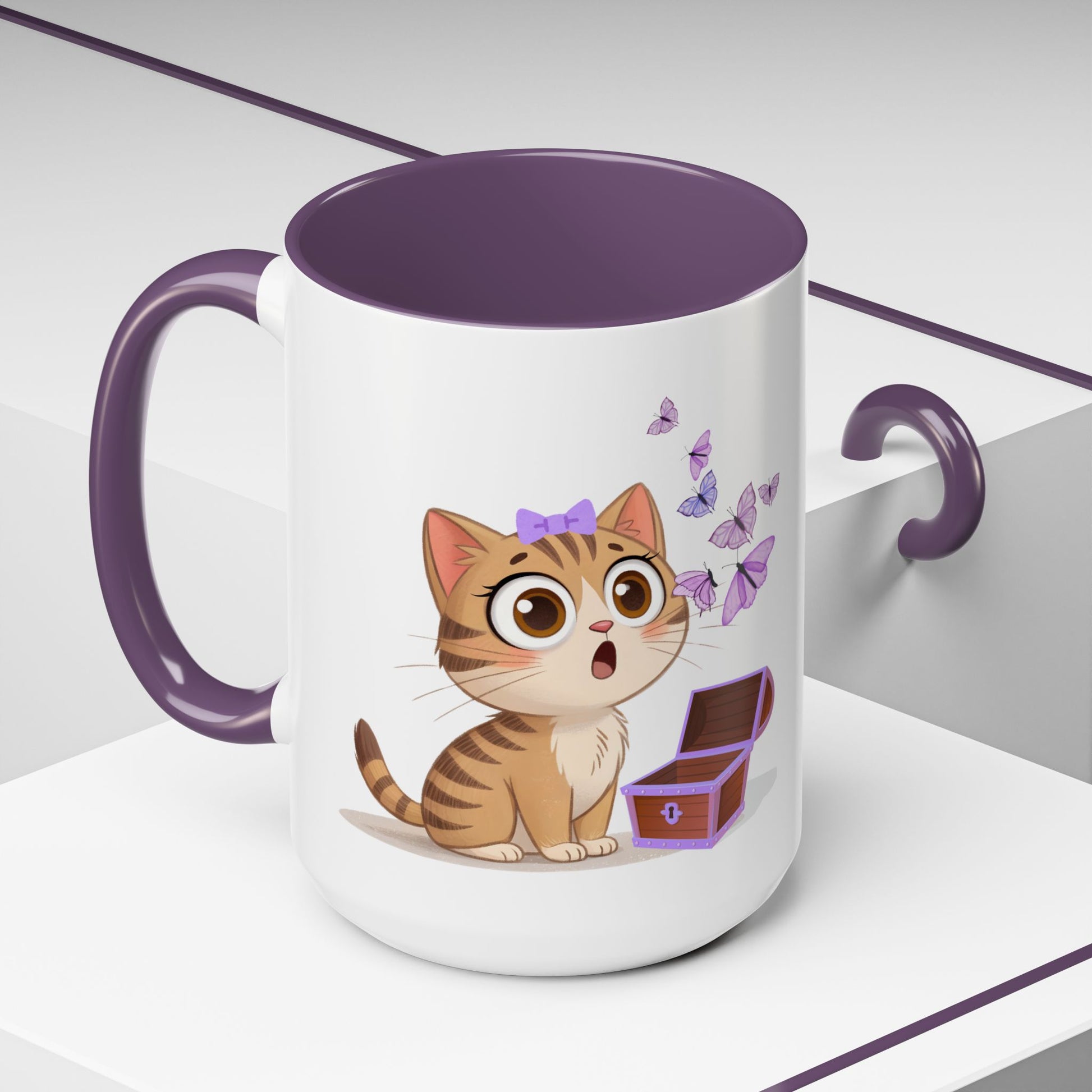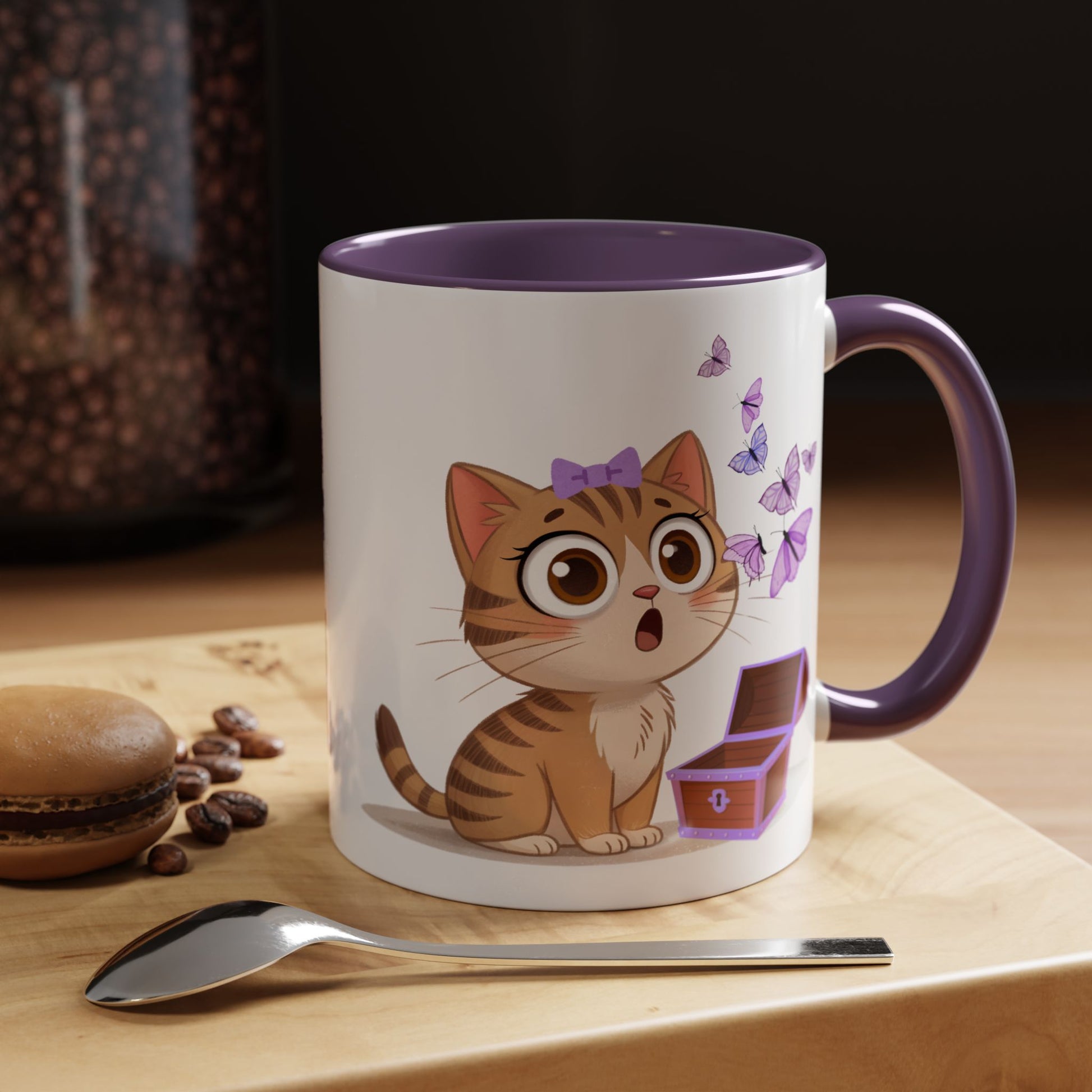 Morning light, warm hands, and a tiny burst of wonder — this ceramic accent mug brings a playful moment to coffee, tea, or cocoa breaks. A wide-eyed tabby with a little bow stares in delighted surprise as lavender butterflies float from a tiny treasure chest. The colored interior and handle add a cheerful contrast that lifts the illustration and the mood. Smooth glossy finish feels bright in your hands and is easy to clean, while dishwasher- and microwave-safe ceramics make this mug as practical as it is joyful. Keep it on your desk, shelf, or kitchen for a small daily reminder to notice the little magic in ordinary moments.