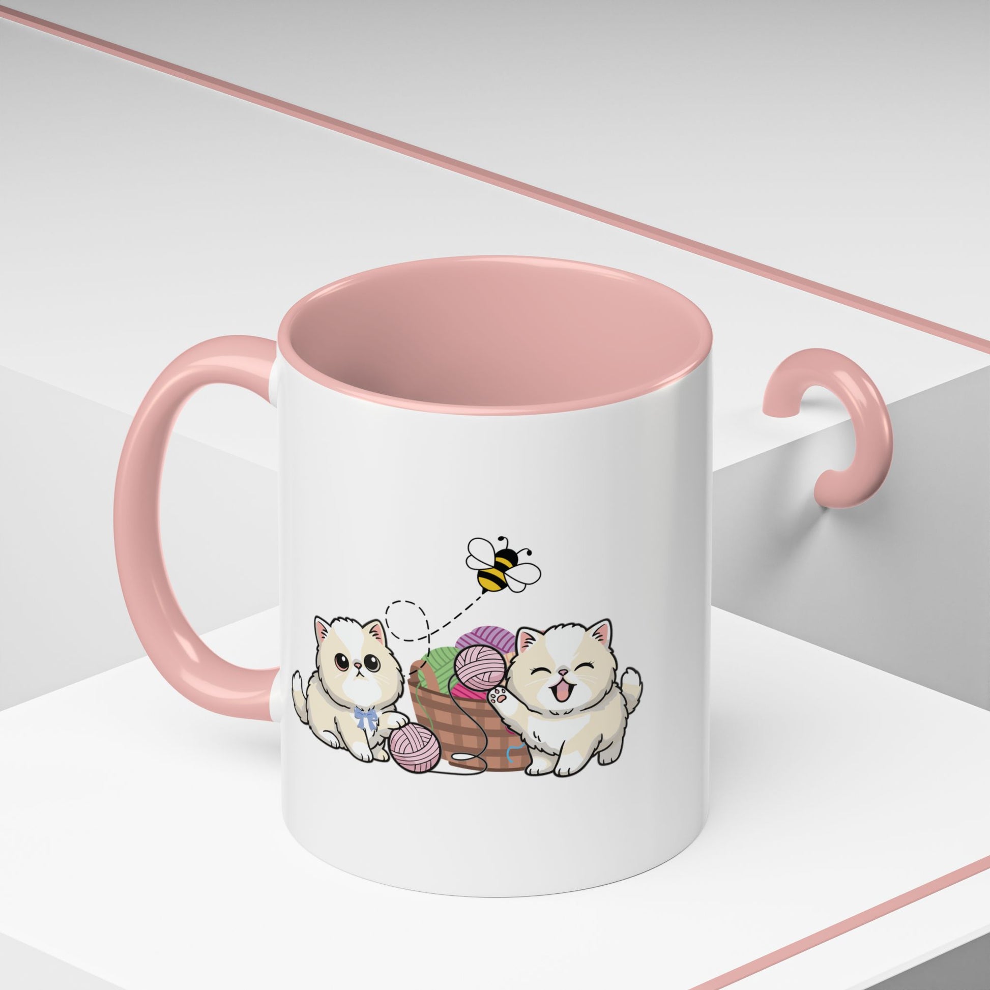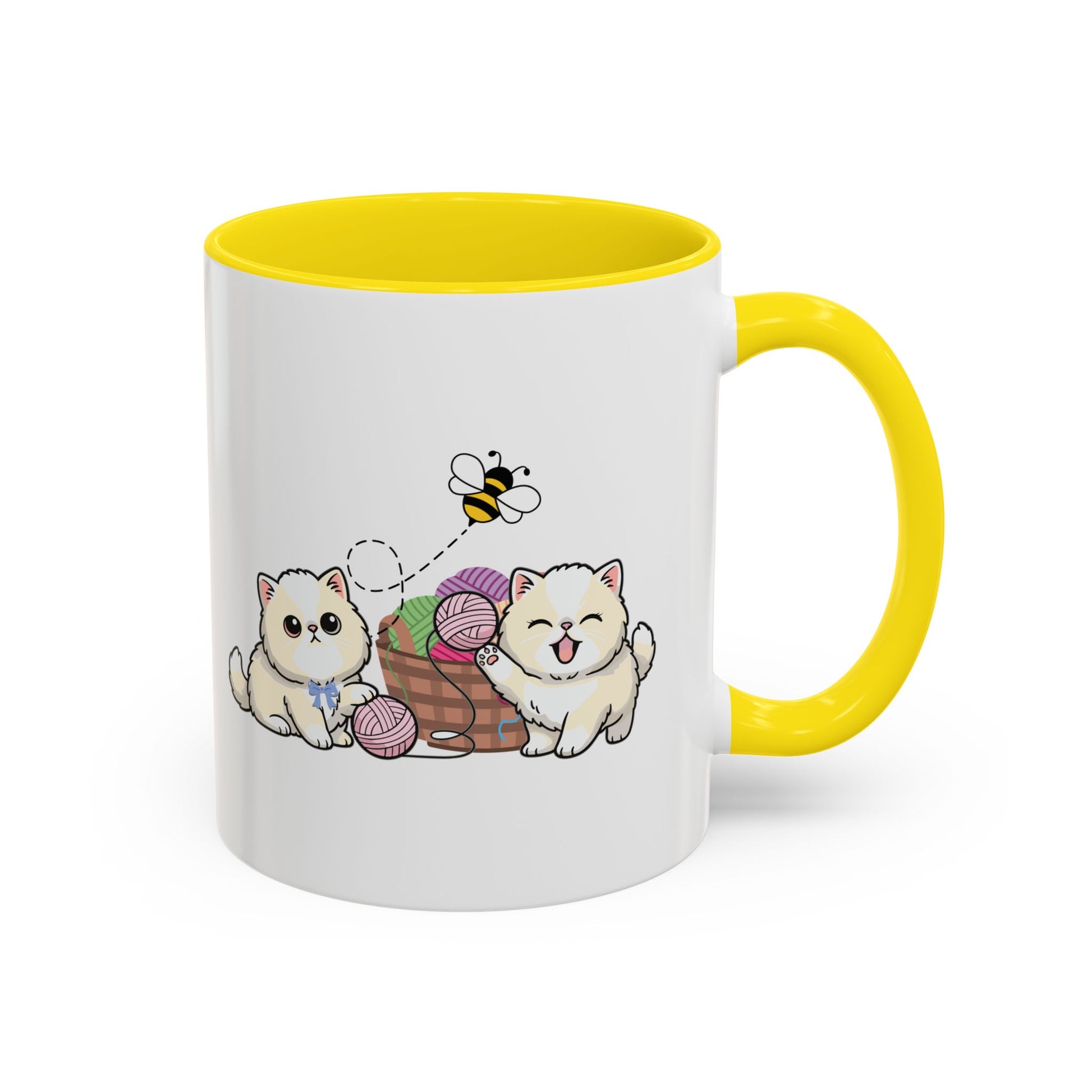 Morning stretches, a warm mug in hand, and two fluffy kittens batting at yarn—this ceramic mug brings a small, joyful scene to your everyday routine. The glossy white exterior contrasts with a colored interior and handle, making the soft, pastel artwork pop. It’s light enough for daily use, sturdy enough for the dishwasher, and safe in the microwave. Let the gentle illustration and bright accent color lift quiet mornings, cozy knitting afternoons, or slow weekend coffee rituals.