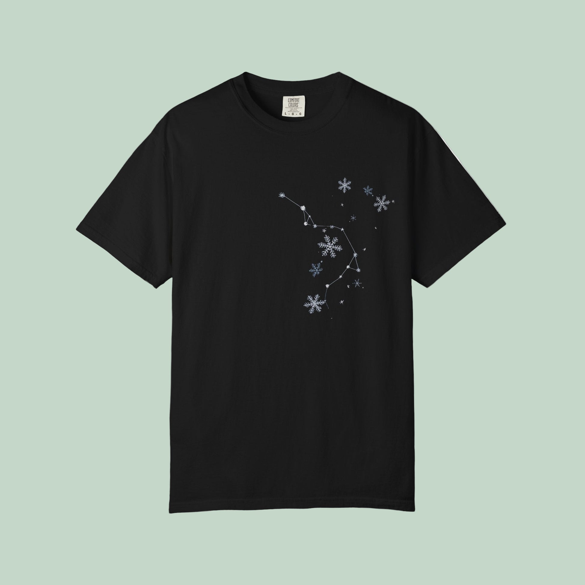 Soft, garment-dyed cotton with a quiet winter night printed across the back and a sprinkling of constellation-like snowflakes that drift over the shoulder. The relaxed fit and medium-weight fabric feel lived-in from the first wear; the tubular knit and double-needle stitching mean it’ll hold shape and keep its color after repeated washes. Wear it on chilly evenings by the fire, at a low-key holiday market, or under a coat for walks through frosted streets—the design reads like a small, personal snowfall every time you move.